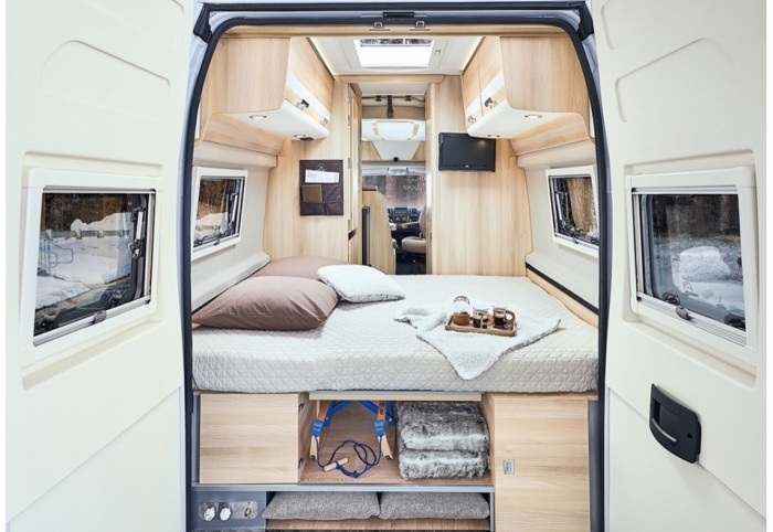 Hyper modulable, vous pourrez aisément voyager à quatre grâce au lit pavillon assisté par vérins, situé à l’avant, qui vous permettra de profiter d’un lit double en place en un clin d’œil. La journée il saura se faire discret sous la hauteur H3 du LIVING VAN pour profiter au maximum des espaces cabine et salon. Le lit pavillon est habilement dissimulé sous la casquette polyester du LIVING VAN. À l’arrière, le maxi salon en U se transformera en couchage confortable de 1855 x 1370 mm (sommiers peignes), et ce, en un tour de main comme nous le montre Valentin en vidéo :