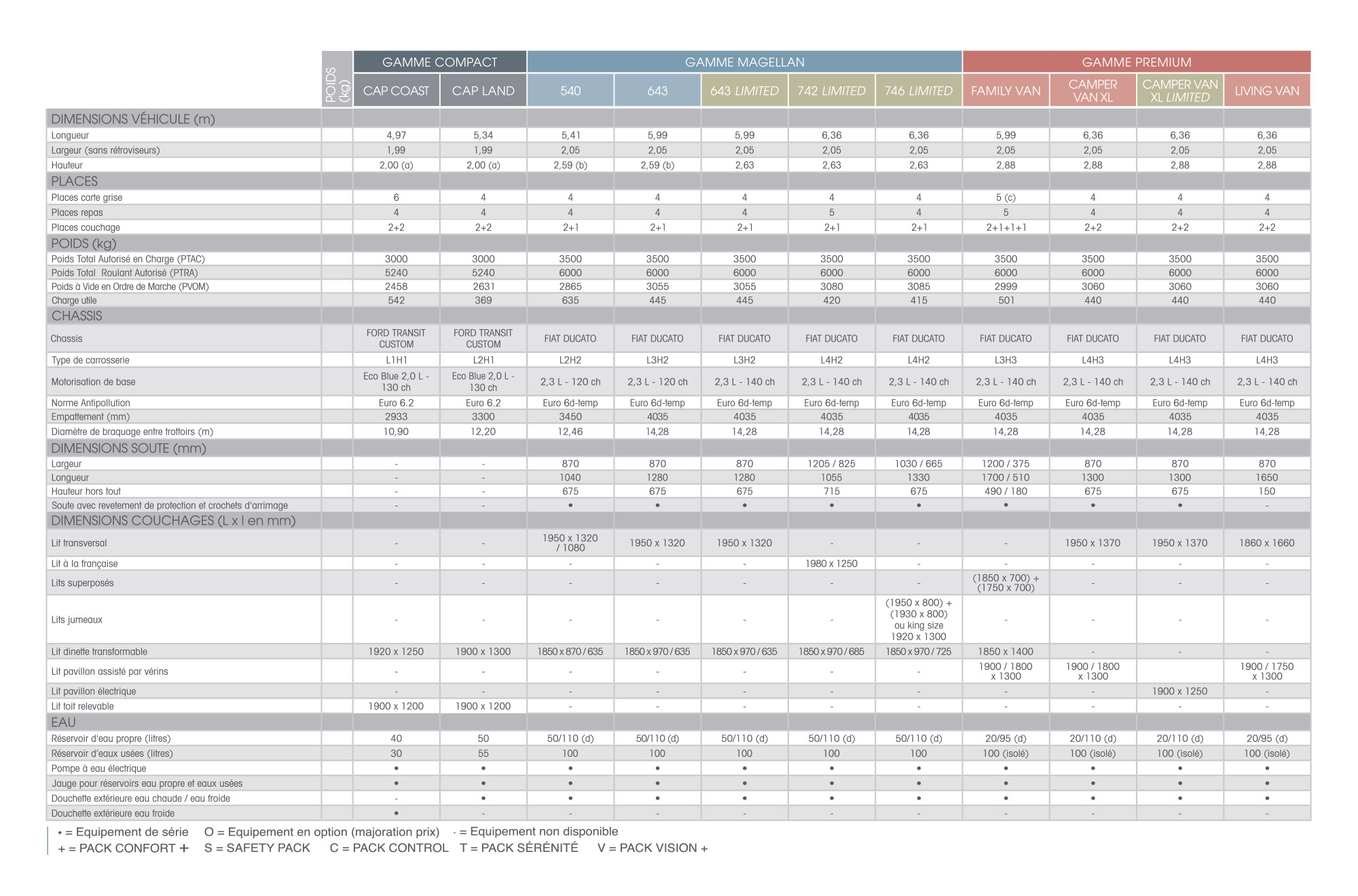 + = PACK CONFORT +, S = SAFETY PACK, C = PACK CONTROL, T = PACK SÉRÉNITÉ, V = PACK VISION +