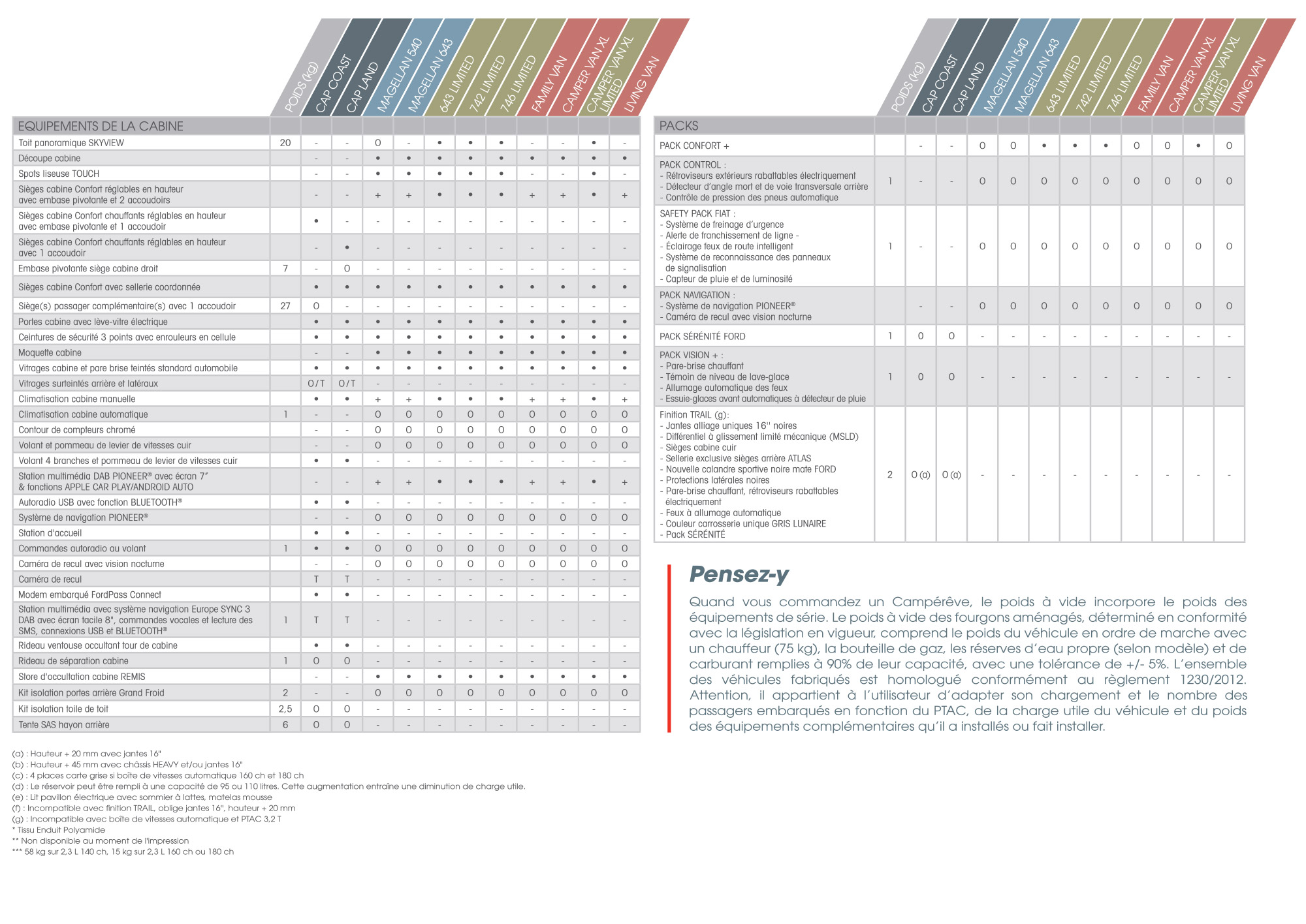 Quand vous commandez un Campérêve, le poids à vide incorpore le poids des équipements de série. Le poids à vide des fourgons aménagés, déterminé en conformité avec la législation en vigueur, comprend le poids du véhicule en ordre de marche avec un chauffeur (75 kg), la bouteille de gaz, les réserves d’eau propre (selon modèle) et de carburant remplies à 90% de leur capacité, avec une tolérance de +/- 5%. L’ensemble des véhicules fabriqués est homologué conformément au règlement 1230/2012. Attention, il appartient à l’utilisateur d’adapter son chargement et le nombre des passagers embarqués en fonction du PTAC, de la charge utile du véhicule et du poids des équipements complémentaires qu’il a installés ou fait installer.